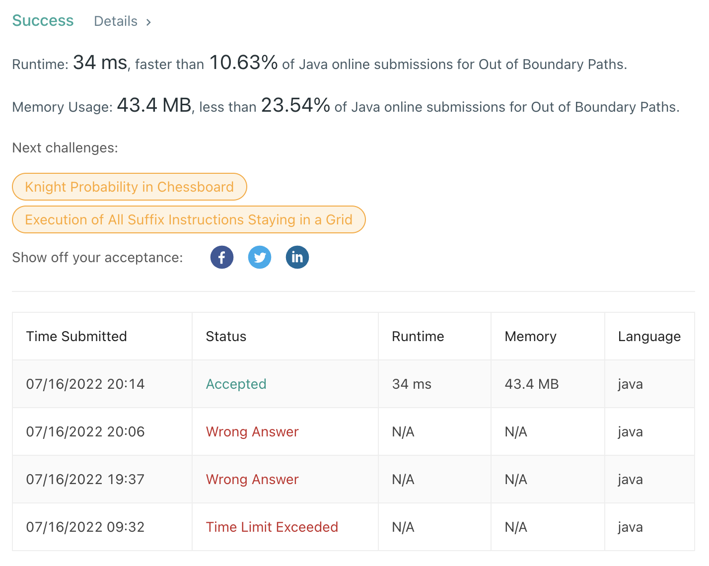 처음에는 문제를 보고 어제 풀었던(695. Max Area of Island) 문제와 비슷하게 maxMove 만큼 bfs 탐색을 통해서 밖으로 공을 내보낼 수 있는 모든 경우를 탐색한다고 생각을 했다.